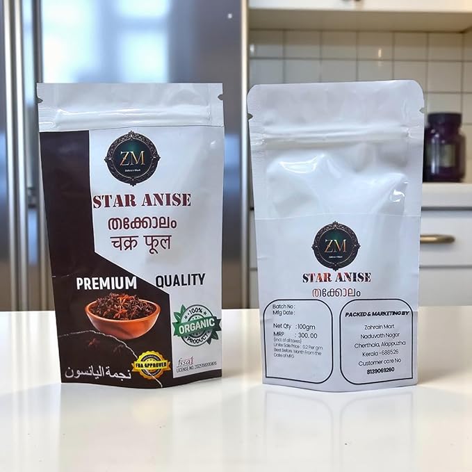 Experience the authentic taste of India with ZM Organic 7-in-1 Spice Combo Pack, featuring Cinnamon, Star Anise, Mace, Cloves, Jeerakam (Cumin), Cardamom, and Black Pepper – each carefully handpicked from Kerala’s lush spice farms. This premium collection of 100% pure, natural, and organic whole spices brings you the true essence of Indian flavor and aroma. Our spices are FSSAI certified, non-GMO, and free from preservatives, artificial colors, or additives. Each spice in this combo is hygienically packed in airtight 100g resealable pouches to retain maximum freshness, aroma, and potency. Whether you’re preparing Indian curries, biryanis, herbal teas, desserts, or wellness remedies, this all-in-one pack provides the perfect blend of taste and health. From the warmth of Cinnamon and the rich fragrance of Cardamom, to the bold flavor of Black Pepper and Jeerakam, every ingredient enhances your dishes naturally. Ideal for home kitchens, gifting, and daily wellness use, this combo supports digestion, immunity, and overall health. Known for their antioxidant, anti-inflammatory, and detoxifying properties, these spices are a must-have in every household that values purity and authenticity. 🌿 Why Choose ZM Organic Spices? ✅ 100% Organic & Natural Kerala Spices ✅ Premium Quality & FSSAI Approved ✅ Hygienically Packed in Airtight Pouches ✅ Strong Aroma, Fresh Flavor, Long Shelf Life ✅ Perfect for Cooking, Tea, Ayurveda & Gifting 🌿 Includes (7 x 100g Each): Cinnamon (Dalchini) Star Anise (Chakra Phool) Mace (Javitri) Cloves (Laung) Jeerakam (Cumin) Cardamom (Elaichi) Black Pepper (Kali Mirch)